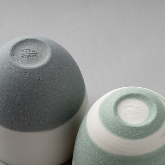 直島の海の色「直島ブルー」をイメージしたグリーンと、コンクリ―トを想起されるグレーの2色展開です。職人が 1点1点手作業で色をつけるため、模様の出方が異なります。