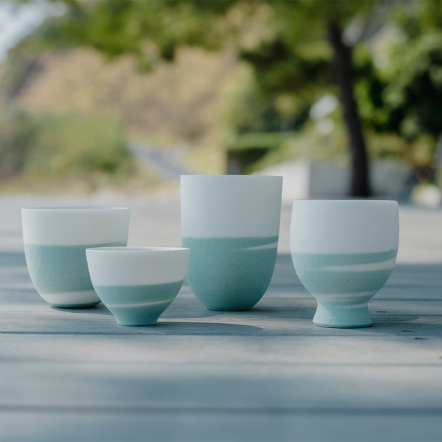 It is available in two colors: blue, representing 'Naoshima Blue' (the name given to describe the color of the ocean around Naoshima), and grey, inspired by the color of concrete. Hand-painted by artisans, the pattern on each cup is unique.